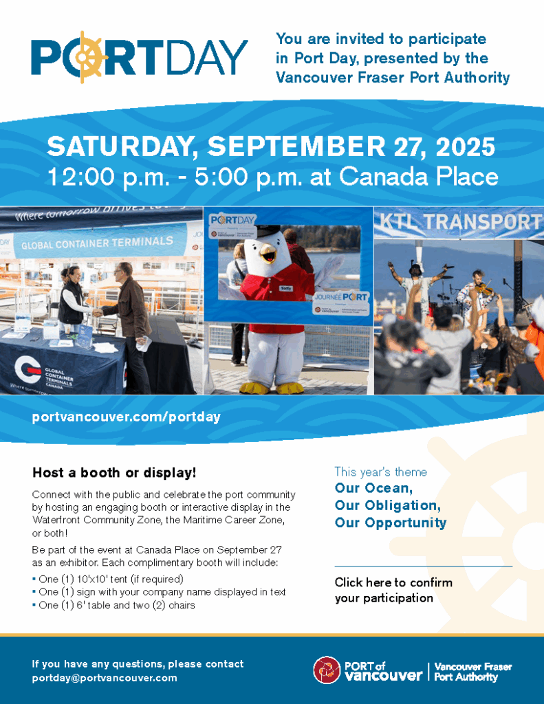 Vancouver Fraser Port Authority has invited the JSCA to participate in Port Day on Saturday, September 27 from Noon-1700H at Canada Place.