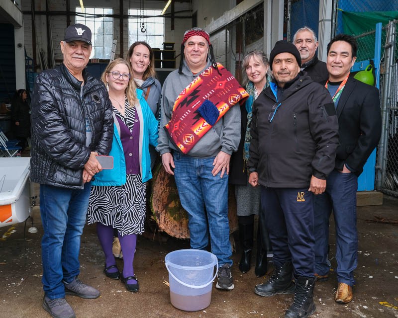 On March 4, 2026, Jody Sparrow xԝməӨkԝəy’əm (Musqueam) and Skwxwú7mesh (Squamish) Carver, Artist, and ticketed professional carpenter along with family and community members blessed the log that he will be carving into the first Coast Salish ocean-going canoe launched in a long time. Guided by local elders and involving members of all three local First Nations, Jody and his team of apprentices will be working in the Jericho Sailing Centre hangar over the next few months before moving over to the grassy area south of the plaza were they will continue their work until launch later this year. The project is being supported by the Pacific Public Health Foundation and is meant, among other goals, to bring traditional knowledge back into practice and to build relationships across communities.