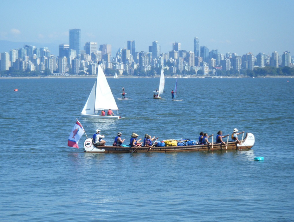 | | Rivershed Society annual canoe trip down the Fraser River concludes amongst fleets of other craft vying for shorespace on Jericho Beach in the shadow of the wharf demolition crane. |
